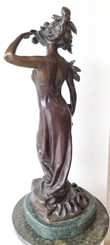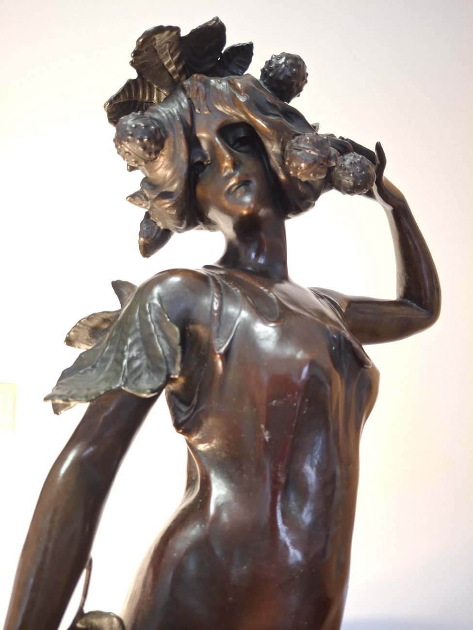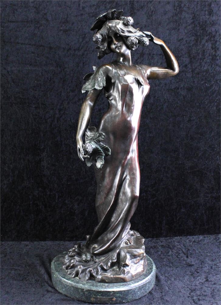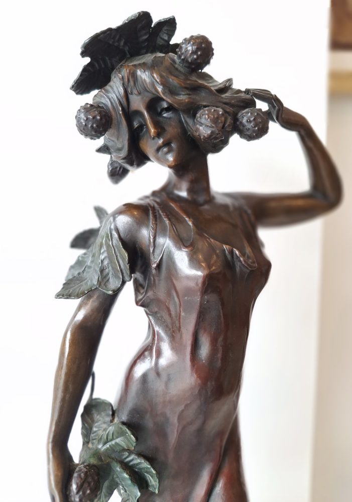Bronze sculpture by the French artist Lucien Charles Edouard ALLIOT (*1877 Paris-1967), early 20th century, Art Nouveau. Depicting a young grace with fruit and vine leaves. Signed L. Alliot on the base, casting number 17/90, equipped with a brass label "By Alliot" on a marble base. Height 63 cm, diameter of the base approximately 25 cm, weight: 16.6 kg.