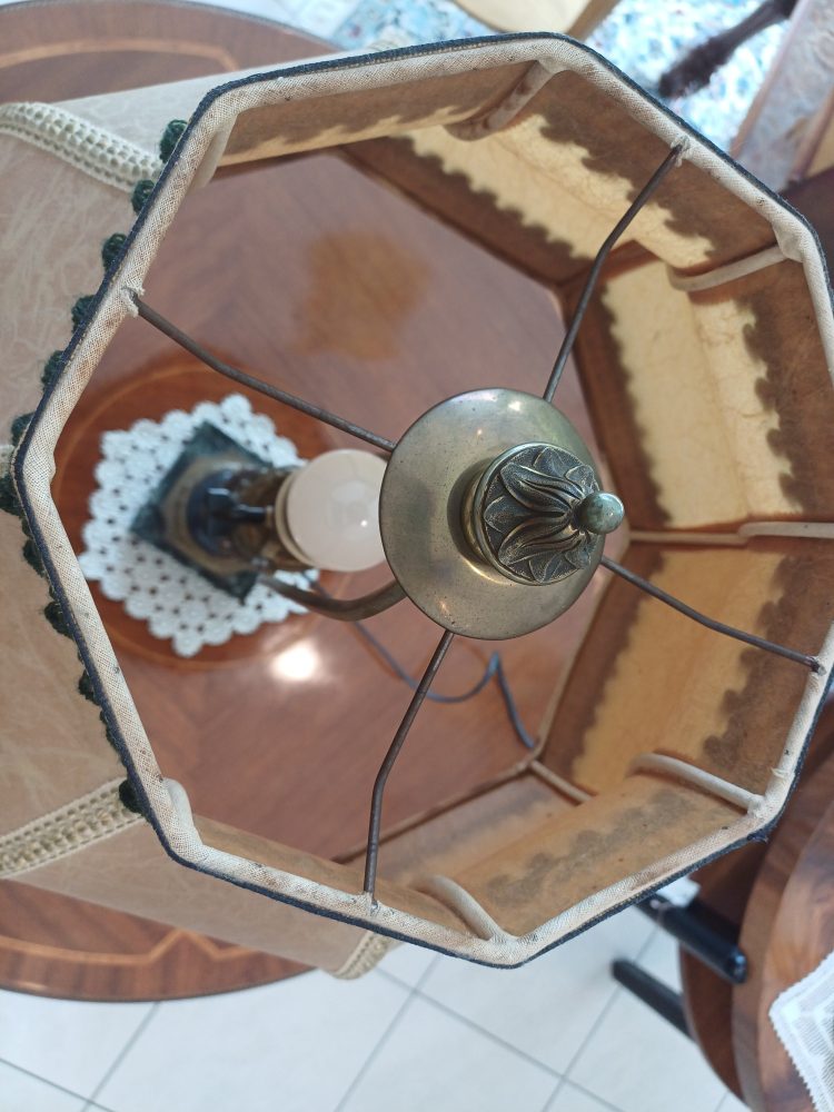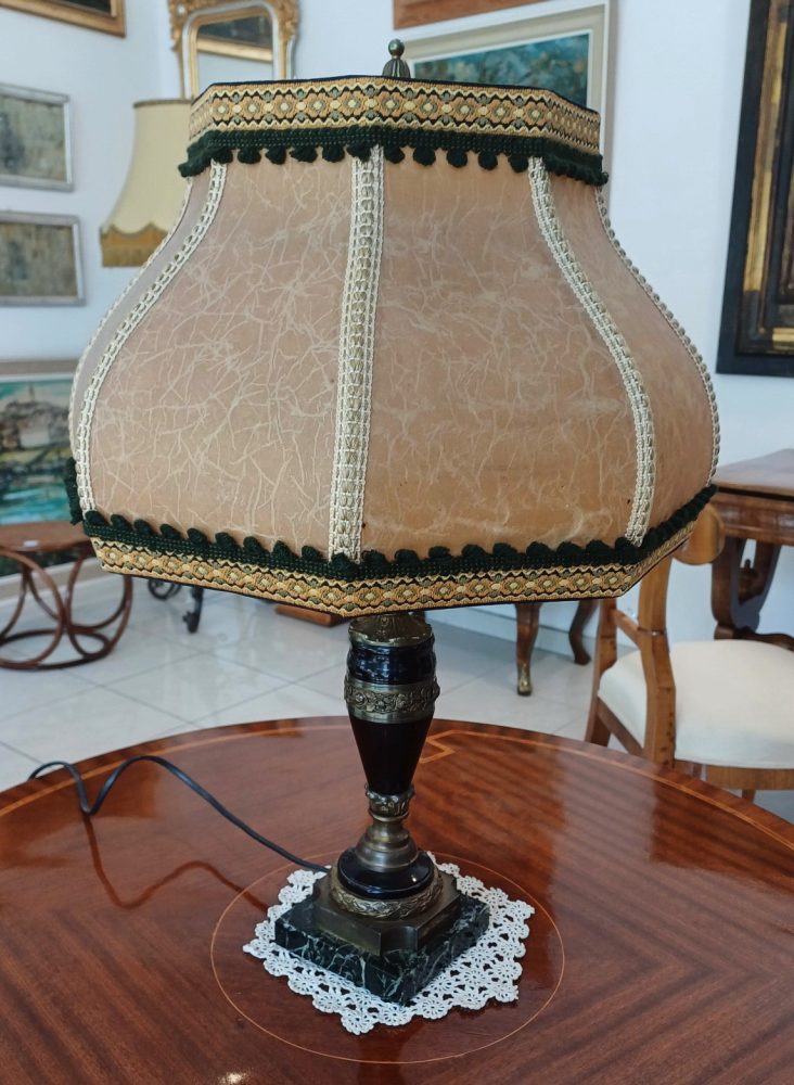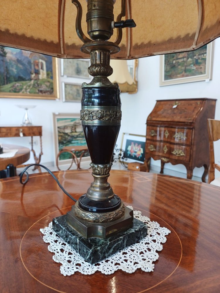 Namizna dekorativna svetilka, iz začetka 20. stoletja, kamniti podstavek dekoriran z okrasjem iz patinirane medenine, originalni senčnik iz pergamenta. Na novo elektrificirana. Mere: premer senčnika: 35 cm, višina: 55 cm.