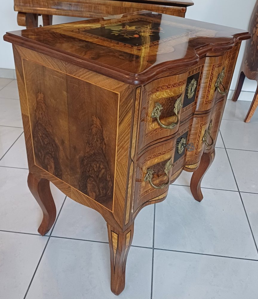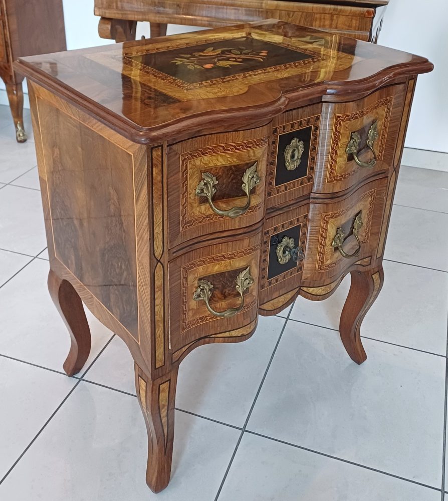 Majhen predalnik, izdelan v baročnem stilu, leta 1881, furniran z več vrstami furnirja in razkošno intarziran. Ročaji so originalni, iz medenine. Predalnik je signiran in datiran. Obnovljen v naši restavratorski delavnici (ročna šelak politura). Mere: 66 x 46 x 76 (v) cm.